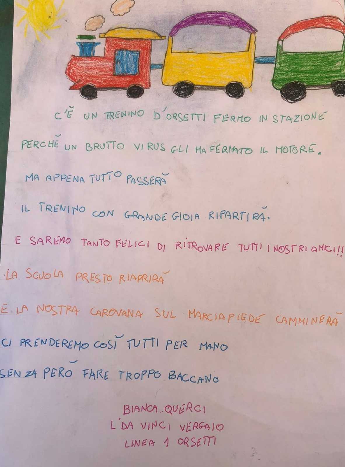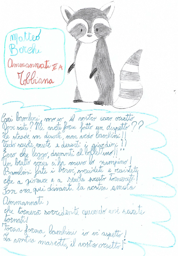 Siamo in terra toscana e di certo non manca una tradizione di stornellatori, poeti e lirici. L'invito è stato quello di scrivere una filastrocca in rima, avendo come tema di fondo l'emozione che l'animaletto/mascotte della propria linea prova nel non accompagnare più i bambini a scuola tutte le mattine. Sono arrivate tante poesie, filastrocche, persino un pezzo rap!!
