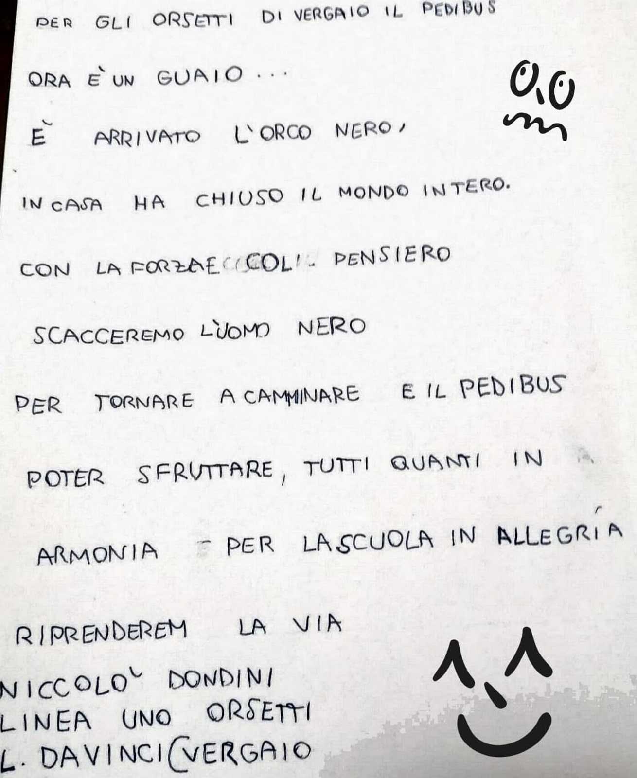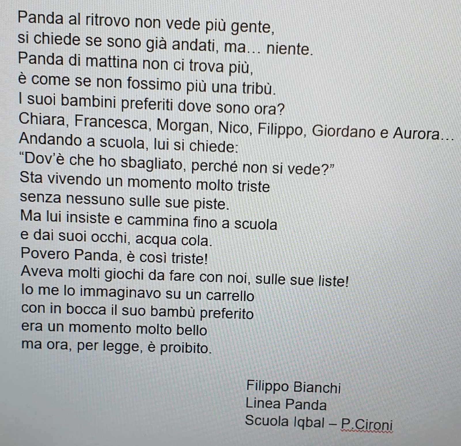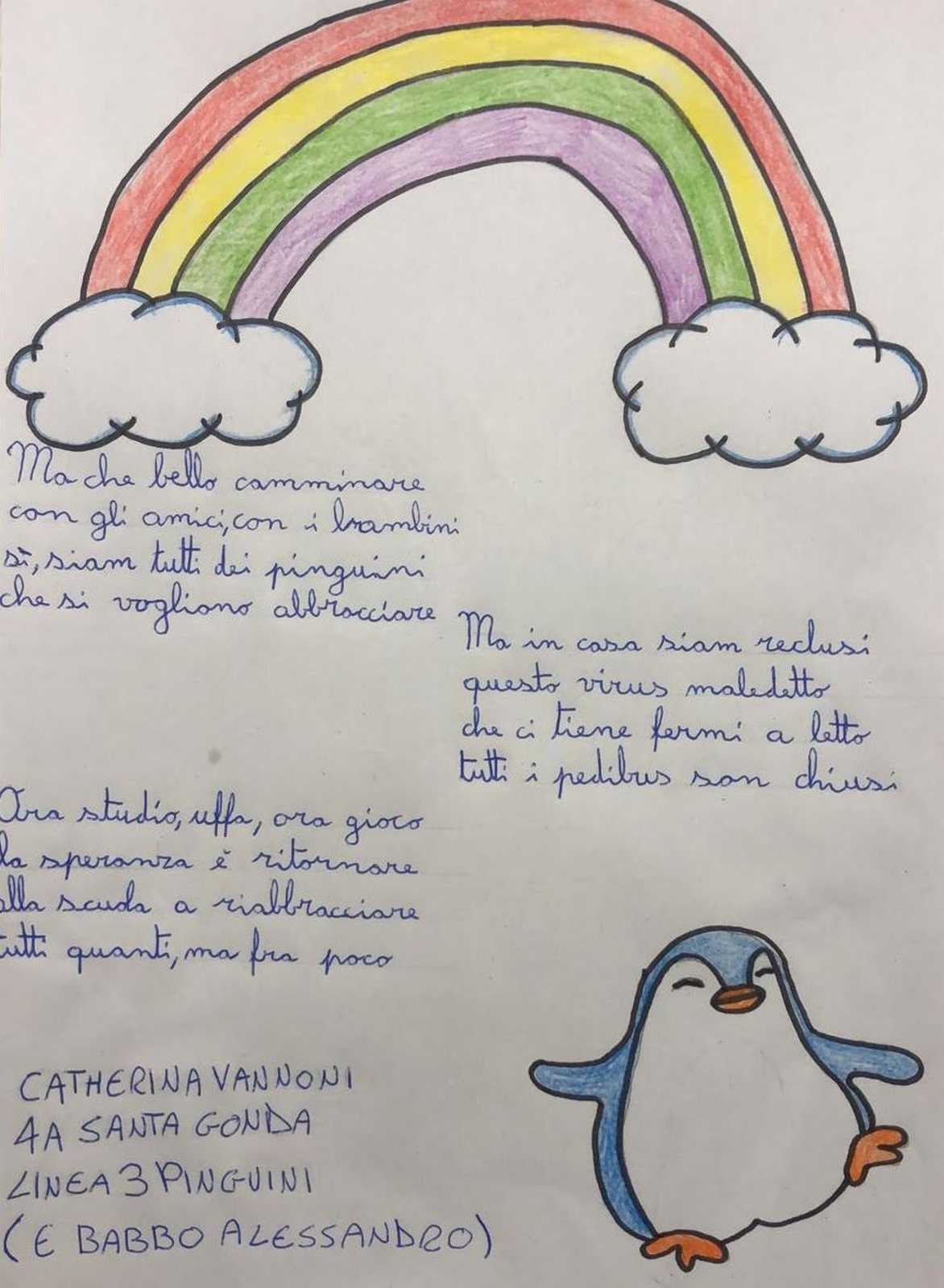 Sstrofe dolci e un po' nostalgiche, che ben fanno emergere la fatica e il sacrificio che i nostri giovani pedibus stanno facendo per rispettare questo lungo periodo di quarantena. Ma a parte un velo di tristezza inevitabile, emerge forte anche la voglia di tornare a ripartire con la stessa energia di prima! Forza amici, teniamo duro, i vostri orsetti, panda, pinguini e lupi vi aspettano!